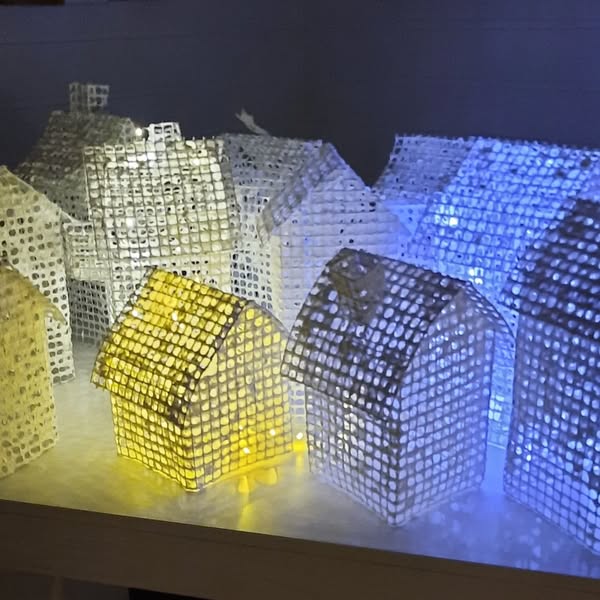 Valmistat metalliverkosta pienen talon, joka kastetaan paperimassassa. Talo saa valkoisesta paperista kauniin kuuran pintaansa ja led-valot tuovat talon muodot hienosti esiin sisältä käsin. Pajassa voi talon muodon leikkaamisesta jääneitä verkon paloja muokata ja kastaa paperimassassa. Näistä voi tehdä koristeita kortteihin, kuuseen tai vaikka ikkunaan.